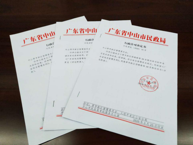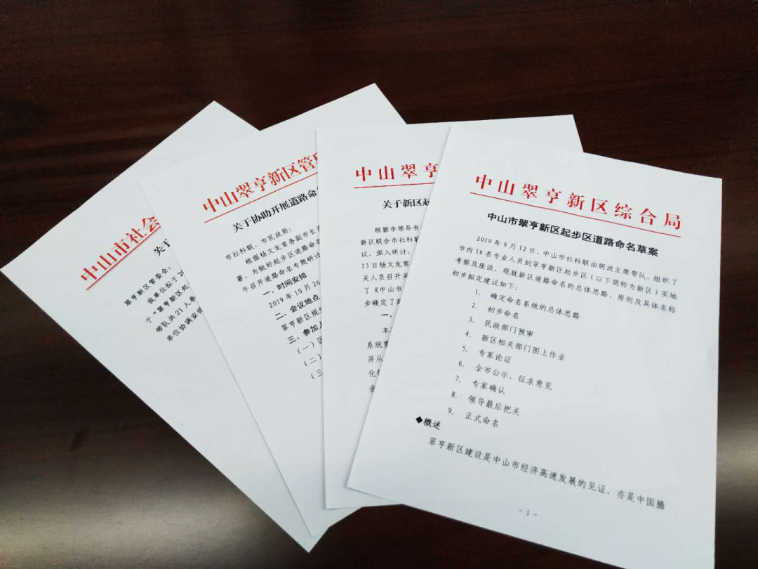 为做好此次道路命名工作,新区广泛发动社会力量参与,联合市社科联、中山经济研究院、市地名办等单位和中山社会文化名人多次召开专题研讨会,借助“外脑”、集思广益,从道路命名原则、路名规范、命名思路、路名文化内涵、路名内在联系等方面反复研究,形成道路命名的整体架构方案,并向社会各界广泛征集命名创意和路名300多个。在此基础上,遴选、提炼出100个备选路名,经过反复斟酌、精挑细选和道路匹配,形成最终方案,经过公示后,报市民政部门审批通过。整个命名过程可谓精雕细琢,千锤百炼。