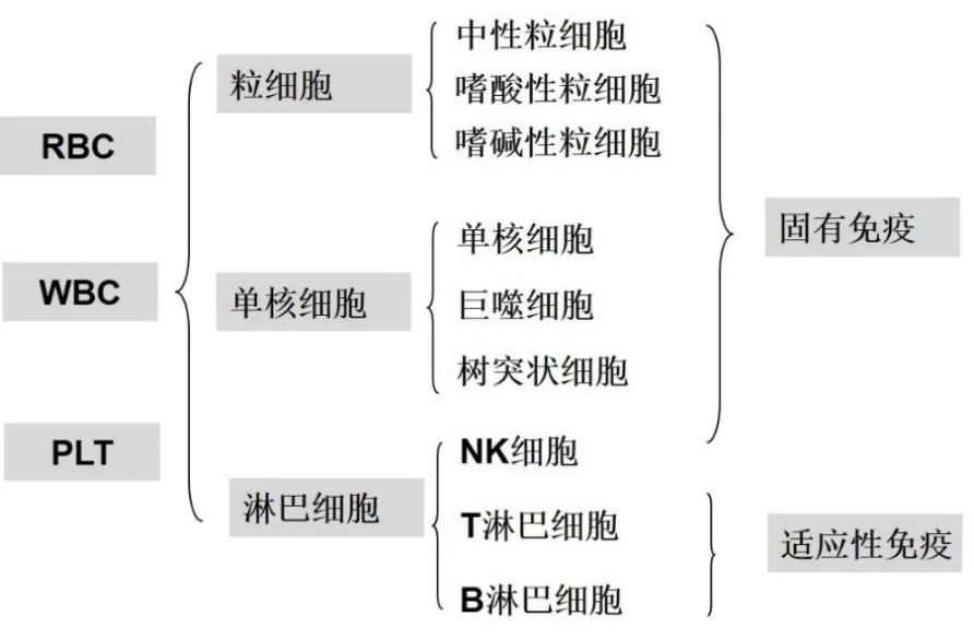 血液中的细胞大致可分为三类:白细胞、红细胞和血小板。白细胞又分为粒细胞、淋巴细胞和单核细胞。粒细胞再细分为中性粒细胞、嗜酸性粒细胞和嗜碱性粒细胞;淋巴细胞再细分为T淋巴细胞、B淋巴细胞以及NK细胞;单核细胞包括单核细胞、巨噬细胞和树突状细胞。根据免疫细胞所行使功能的不同,将吞噬细胞(包括中性粒细胞和巨噬细胞)、树突状细胞、NK细胞、嗜酸性粒细胞和嗜碱性粒细胞归于固有免疫的组成细胞,而将T淋巴细胞和B淋巴细胞归为适应性免疫应答细胞(图1所示)。简单的讲,可以将这些细胞认为是国家的不同兵种,各司其职,兵种不同,其功能和杀伤力不一样。