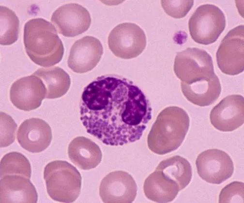 嗜酸性粒细胞(图2)具有杀伤细菌、寄生虫的功能,也是免疫反应和过敏反应过程中极为重要的细胞。嗜酸性粒细胞可以释放颗粒中的内容物,引起组织损伤,促进炎症进展。血液中嗜酸性粒细胞的数量表现为昼夜周期性波动。清晨细胞数减少,午夜时细胞数增多。这种细胞数的周期性变化是与肾上腺皮质释放糖皮质激素量的昼夜波动有关的。当血液中皮质激素浓度增高时,嗜酸性粒细胞数减少;而当皮质激素浓度降低时,嗜酸性粒细胞数增加。