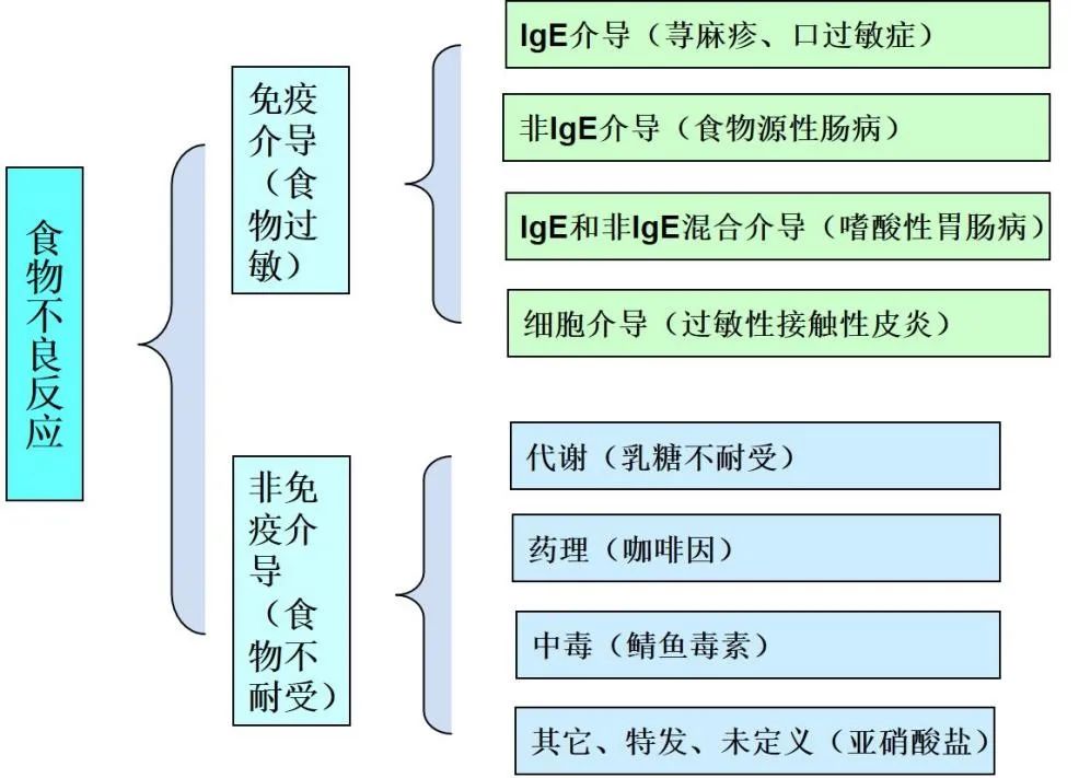 既往,我们把食物特异性IgG检测称为食物不耐受,随着人们对食物不良反应的认识,发现,这个概念是完全错误的。我们的食物过敏和食物不耐受均属于食物不良反应的范畴,无论是IgE介导的还是IgG介导的,都有免疫机制的参与,因此都归于食物过敏的范畴。而食物不耐受是指由于机体本身的不良状态或者某些食物的毒性反应导致的食物不良反应(如图5所示)。因此,食物不耐受和特异性IgG没有任何关系。
