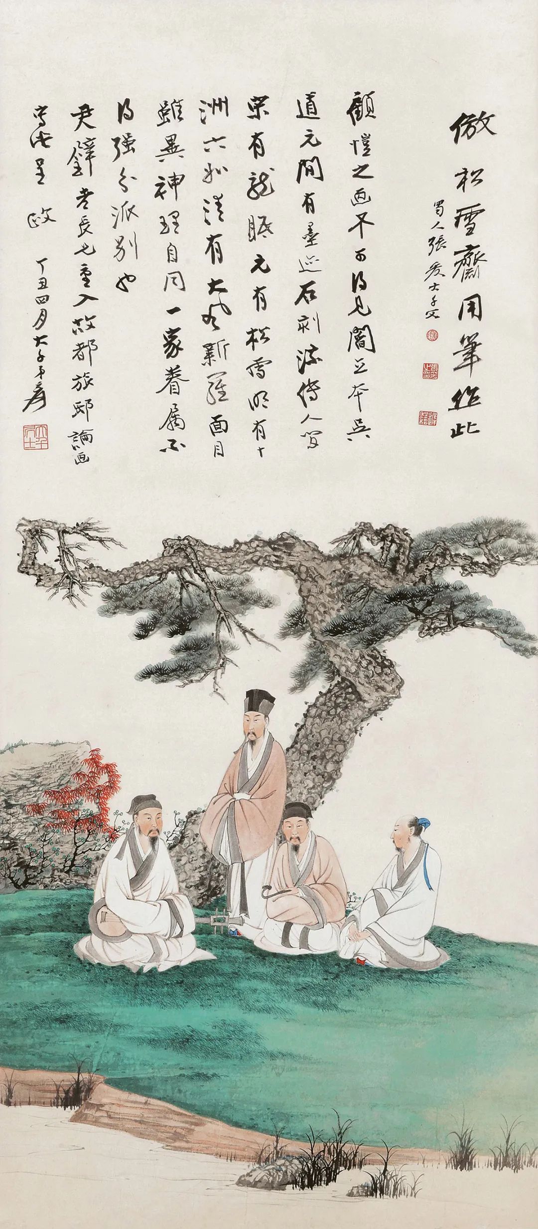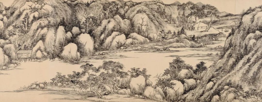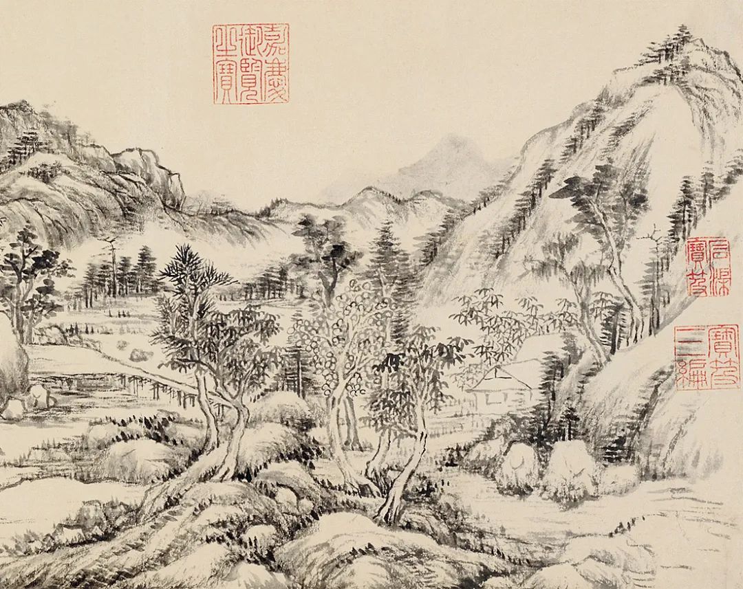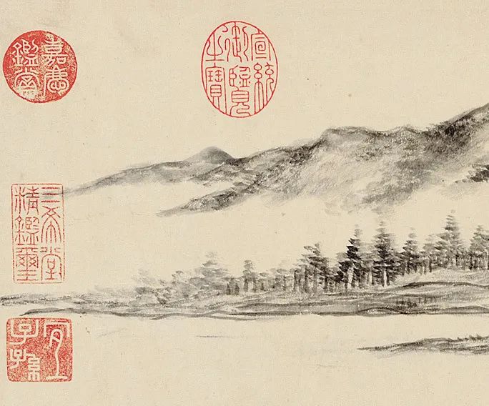 《素濑松唫》同样著录于《石渠宝笈》续编,盖有“三希堂精鉴玺”、“宜子孙”、“石渠宝笈”、“宝笈三编”、“嘉庆御览之宝”、“嘉庆鉴赏”、“宣统御览之宝”等印章。弘旿是爱新觉罗·胤祕的儿子,康熙帝的孙子。这幅画笔墨秀润,细皴密擦,松林滃郁,令人有如沐松风之感。