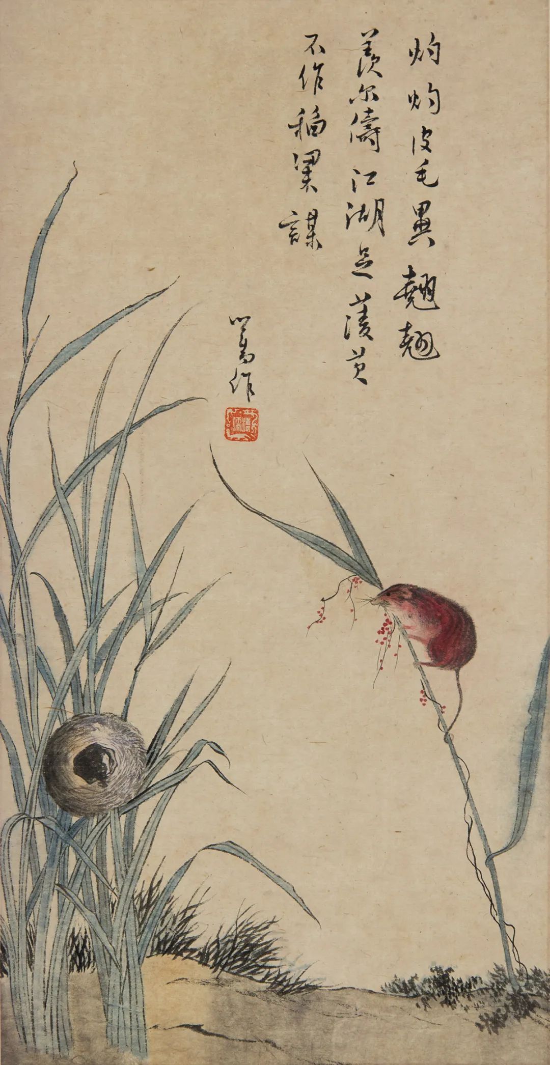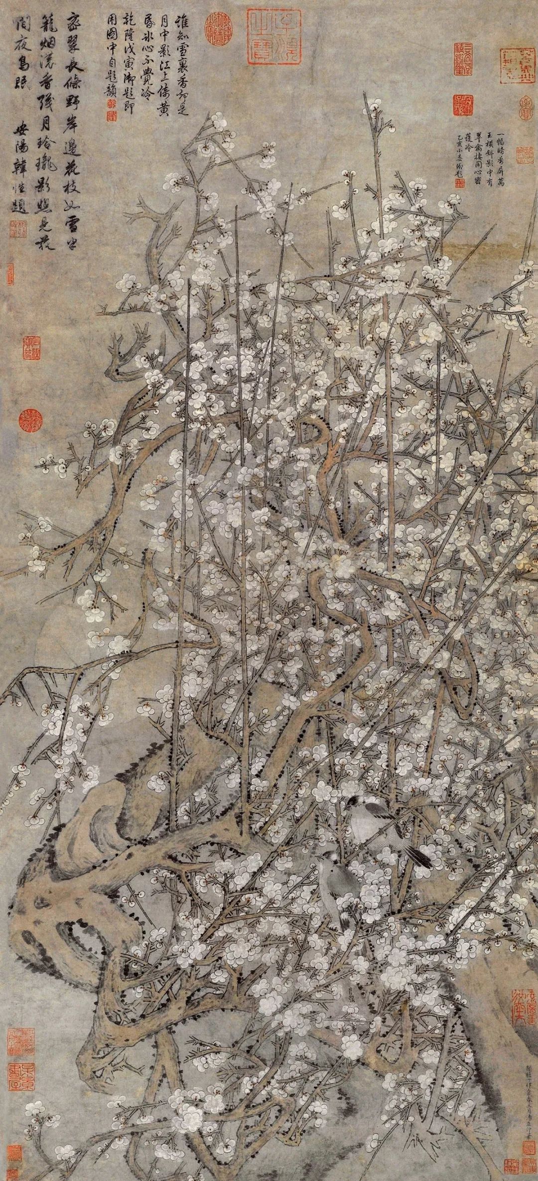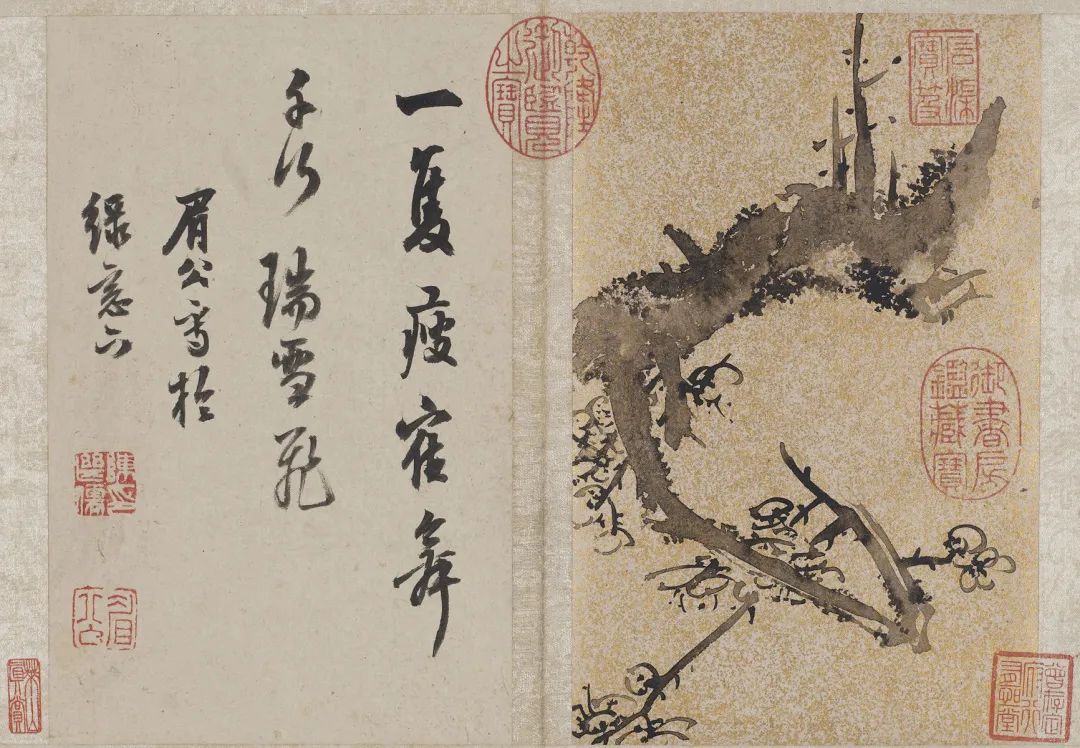 《梅花册》著录于《石渠宝笈》初编,有“乾隆御览之宝”、“石渠宝笈”、“御书房鉴藏宝”、“嘉庆御览之宝”等印。陈继儒是晚明时期的上海人,“松江画派”奠基人之一,《梅花册》是他的盛年力作,绘于金笺纸上,现存八页,每页皆诗画对题。因为喜爱梅花的品行,陈继儒在隐居的寓所周围移植了上百株古梅,经常对梅“写生”,使得他的墨梅成为一项绝艺。