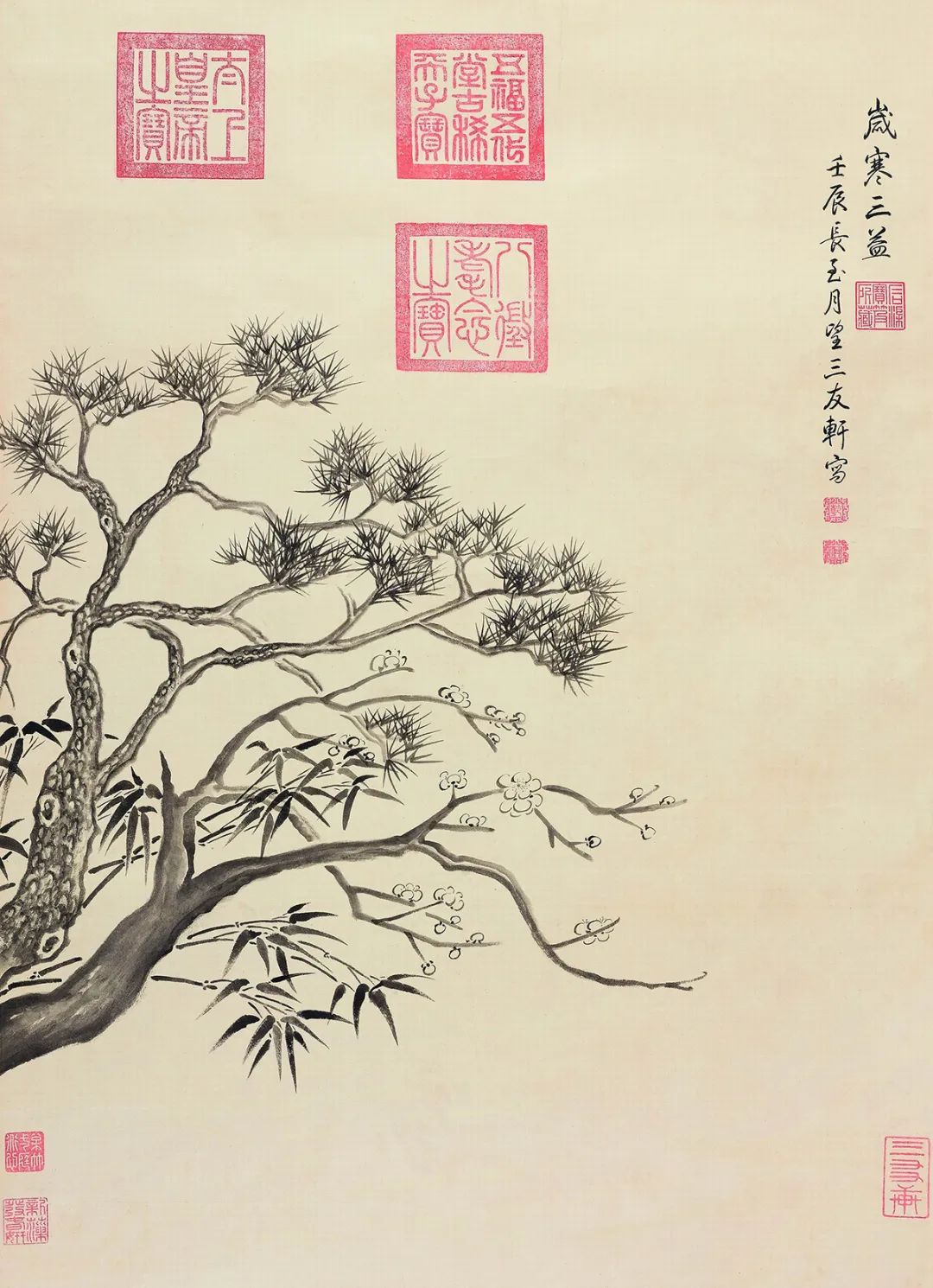 《岁寒三益图》著录于《石渠宝笈》续编,盖有“五福五代堂古稀天子宝”、“八征耄念之宝”、“太上皇帝之宝”、“三友轩”、“石渠宝笈所藏”等印章。这幅画是乾隆皇帝62岁时所作,笔墨简练,着重表现了松、竹、梅的意态神韵和精神内涵。原藏于圆明园的“方壶胜境”。