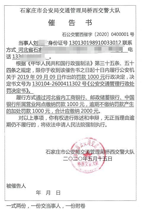 近日,石家庄市公安局交通管理局首先启动对刘某广、周某逾期不缴纳的交通违法罚款,申请人民法院强制执行。