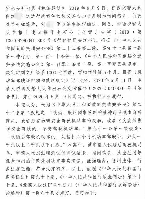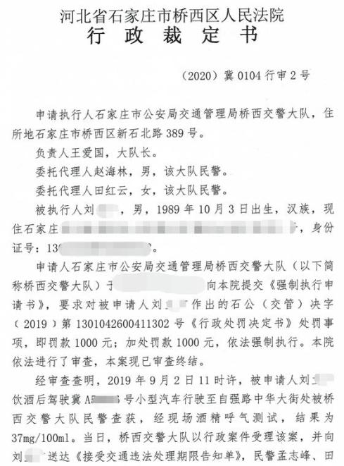 2020年6月11日,石家庄市桥西区人民法院作出(2020)冀0104行审2号《行政裁定书》,准予强制执行对被申请人刘某广罚款1000元,加处罚款1000元。
