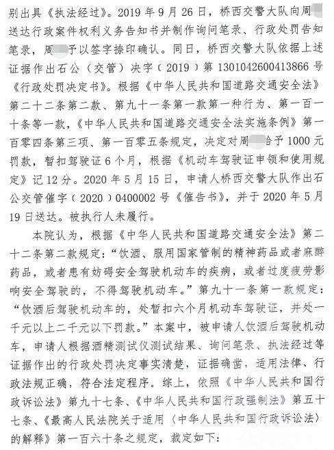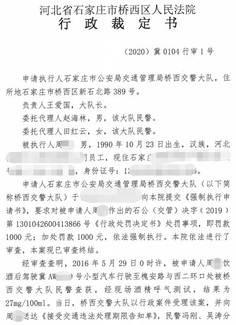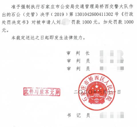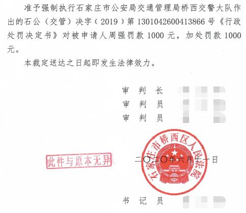 2020年6月11日,石家庄市桥西区人民法院作出(2020)冀0104行审1号《行政裁定书》,准予强制执行对被申请人周某罚款1000元,加处罚款1000元。