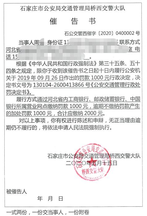 以上两起案例,是石家庄市公安交通管理部门依法向人民法院申请对逾期不履行道路交通安全行政处罚决定的违法行为人实施的一项强制执行措施。
