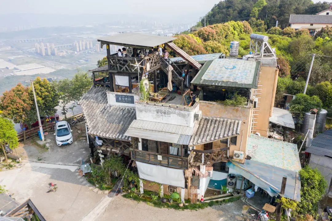 站在露台上背靠江北国际机场,俯瞰玉峰山风景。夜幕降临,山下城市换上迷幻光影,美景尽可一览无遗。