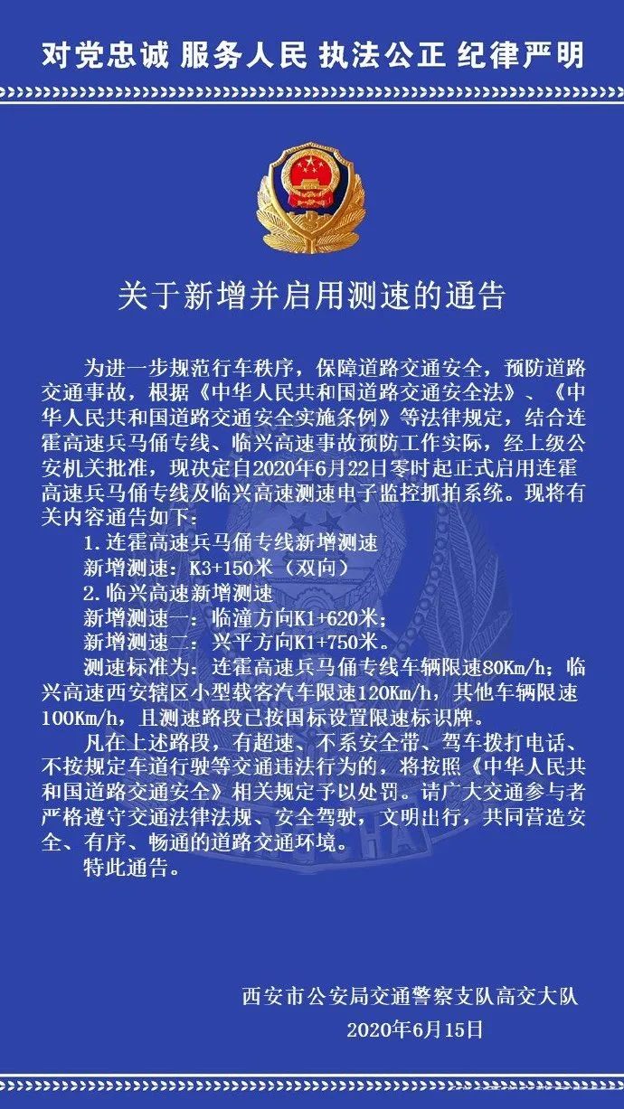 2、临兴高速新增测速一:临潼方向K1+620米;临兴高速新增测速二:兴平方向K1+750米,测速标准为小型载客汽车限速120km/h,其他车辆限速100km/h。