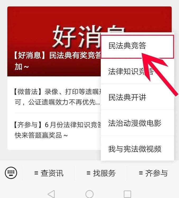 参赛办法:关注“中国普法微信公众号”,在手机下方子菜单“齐参与”中找到“民法典竞答”进入答题页面即可答题。
