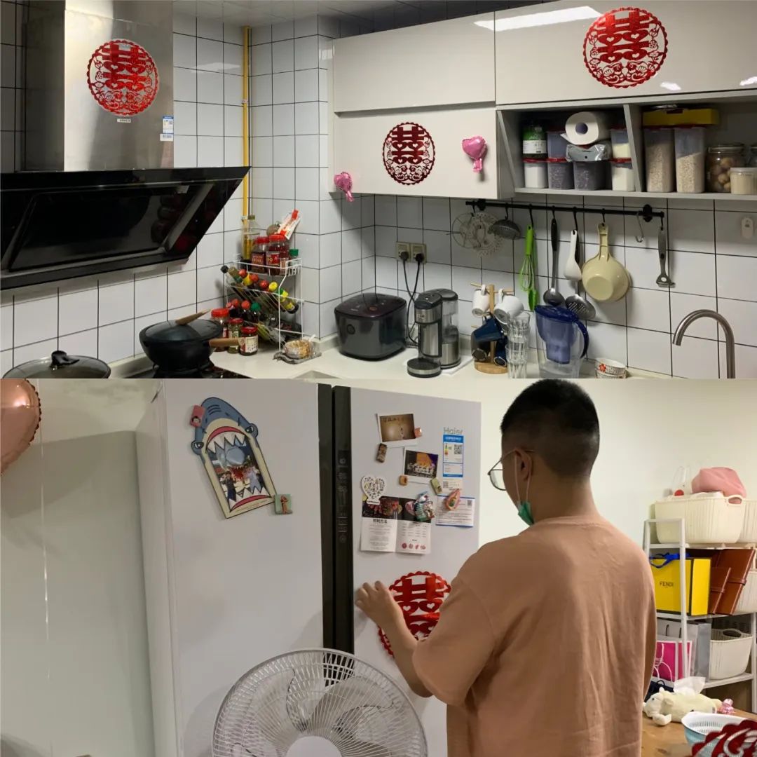 这些人一进房间就像家人一样开始麻利地帮着李裕布置房间,把每一个角落都贴满了喜字。