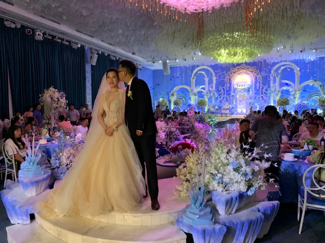 李裕的婚礼是爱琴海主题,李裕穿着长长的婚纱,踩在一只小船上,顺着一条水道,飘到舞台前。