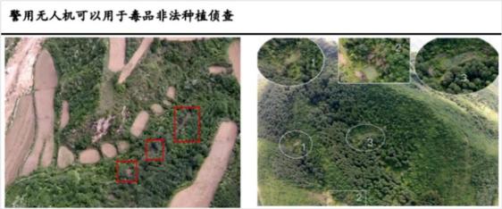 无人机是目前扫毒常用的一个手段。一般无人机机腹下方搭载一个可以大范围、清晰扫描地面情况的高清摄像头,可以自动定点定距拍摄照片,并通过高空传感技术将信息传递给工作人员。警察通过无人机传递的信息先锁定可疑植株,然后进行有目的现场勘查。