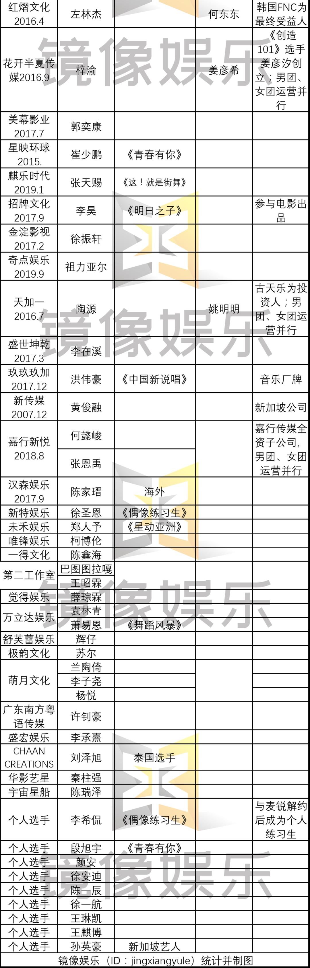 以麦锐娱乐、英模文化为代表的早期“玩家”也选择了回归。麦锐娱乐旗下艺人在《偶像练习生》《创造101》两档节目中的表现为公司偶像厂牌打开知名度,李希侃进入决赛,紫宁成功出道。但在《青春有你》第一季结束后,麦锐娱乐曾陷入“倒闭”风波,与旗下多位艺人解约,被传出现资金链问题。英模文化也在2018年派出王菊等艺人参加《创造101》,虽然最终未出道,但王菊的话题度和人气不亚于出道选手。但节目结束后王菊也与选择英模文化解约。