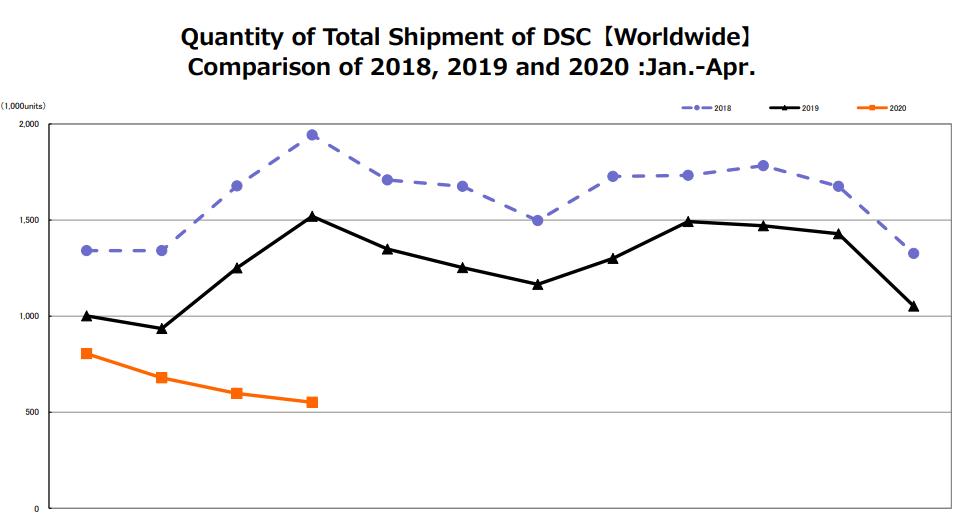 CIPA在6月1日发布的数据显示,今年4月全球数码相机销量比2019年4月减少64%,降至55万台。
