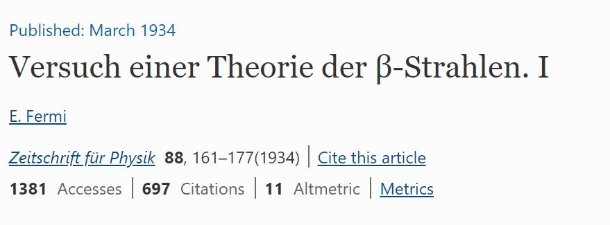 费米在1926年曾提出费米统计理论,与前文的玻色-爱因斯坦统计的玻色子理论正好相反,根据Ricerca Scientifica, 1933年(也是Z. Phys。1934年)的“ Tentativo di una teoria dei raggiß” 提出了一种关于ß射线发射的理论。
