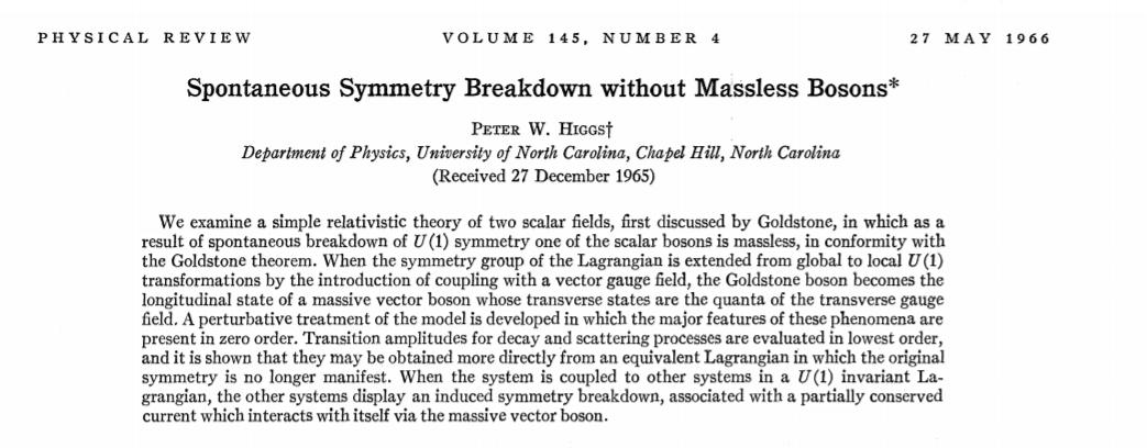 Peter Higgs说,Higgs撰写了第二篇简短的论文(描述了后来被称为“希格斯模型”的内容),并将其提交给《物理评论快报》,但由于它不保证迅速发表而被拒绝。(2013)