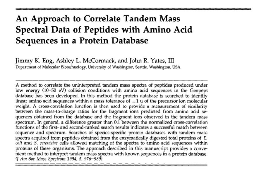 论文:将多肽串联质谱数据与蛋白质数据库中的氨基酸序列相关联的方法(An approach to correlate tandem mass spectral data of peptides with amino acid sequences in a protein database)