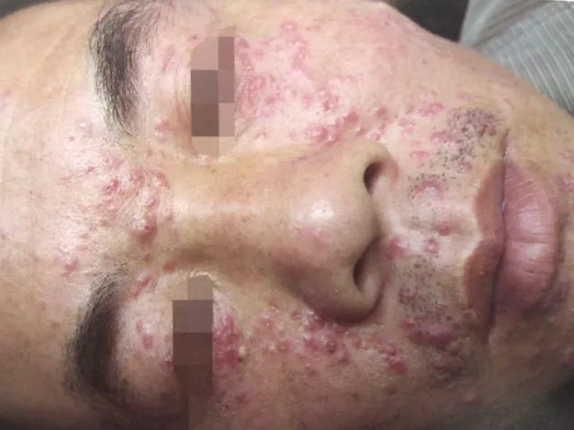 颜面播散性粟粒性狼疮的典型表现,也是红色的疙瘩,跟丘疹脓疱型痤疮以及丘疹脓疱型玫瑰痤疮表现类似。
