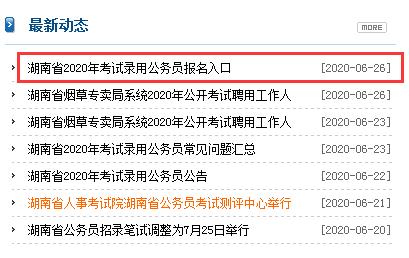 1、登陆湖南人事考试网,找到“近期动态”下面的“湖南省2020年考试公务员报名入口”,如下图: