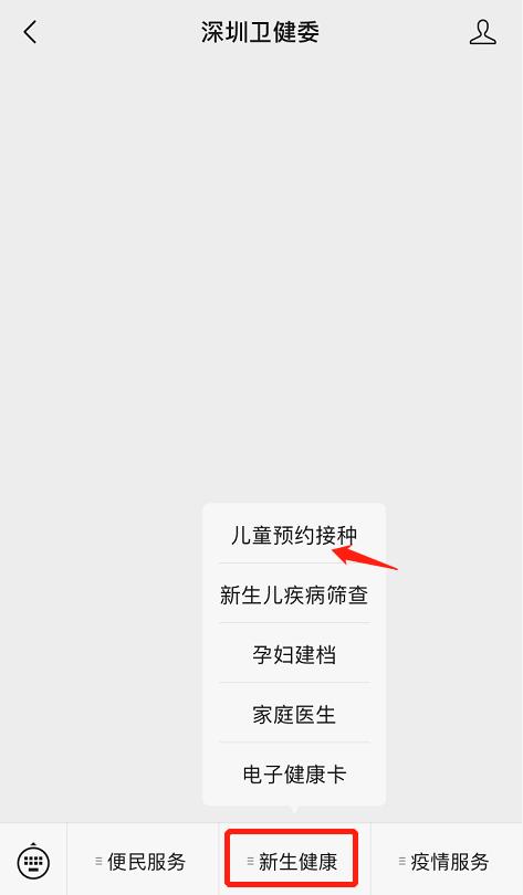 点击公众号菜单栏,“新生健康”-“儿童预约接种”。
