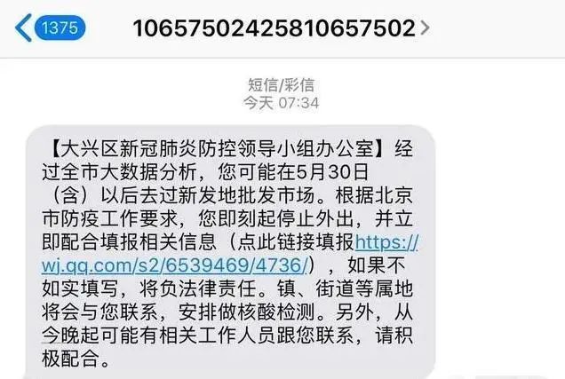从6月15日以来,不少路过或者去过新发地的北京市民,都接到了短息或者是社区电话,表示通过大数据筛查,确认被调查者近期去过或者路过新发地市场,要求如实填报信息,并尽快进行核酸检测。