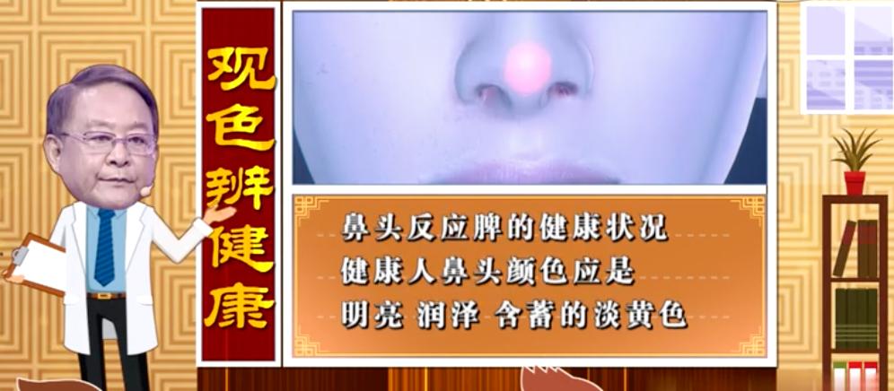 王鸿谟教授介绍,在面部,鼻头反映脾的健康状况,健康人的鼻头应该是明亮、润泽而含蓄的淡黄色。如果脾有问题,鼻头的颜色也会出现相应的变化。