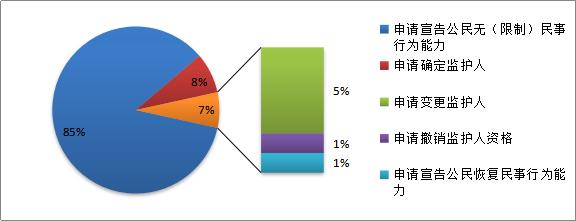 从案由上看,涉监护权特别程序案件的类型主要包括两类,一是首次申请指定监护人的案件,主要包括申请宣告公民无(限制)民事行为能力(合并要求指定监护人)、申请确定监护人;二是请求对已有监护人的资格进行审查变更的案件,主要包括申请变更监护人、申请撤销监护人资格、申请宣告公民恢复民事行为能力等。在2015年至2019年受理的案件中,第一类案件共计693件,其中申请宣告公民无(限制)民事行为能力案件635件(其中合并要求指定监护人案件371件),申请确定监护人案件58件。第二类案件共计51件,其中,申请变更监护人35件,申请撤销监护人资格8件,申请宣告公民恢复民事行为能力8件。(具体数据见图二、图三)