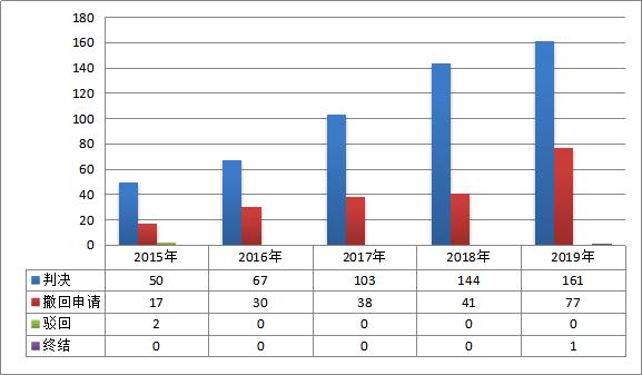 从结案方式上分析,因特别程序案件本身性质及民事诉讼法特别程序案件相关规定,判决依然是特别程序案件结案的主要方式,但近五年来,撤回申请的案件数量明显增多。2015年撤回申请的案件为17件,仅占当年结案总数的25%;在2016年撤回申请的案件为30件,占当年结案总数的31%;2017年撤回申请的案件增加到38件,占当年结案总数的27%;2018年撤回申请的案件为41件,占当年结案总数的22%;2019年撤回申请的案件达到77件,占当年结案总数的32%;(具体数据见图四)