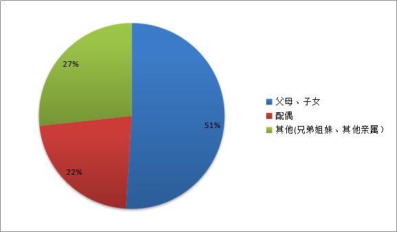申请宣告公民无(限制)民事行为能力与申请确定监护人案件中,由父母、子女等直系亲属担任监护人的比例为51%,由配偶担任监护人的比例为22%,由兄弟姐妹等其他非直系亲属担任监护人的比例为27%。同时,在直系亲属申请担任监护人的案件中,在向法院申请前,大多经过家庭内部协商,就监护人人选问题达成一致意见,各方并无矛盾,仅要求通过司法程序予以确认。(具体数据见图五)
