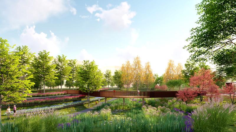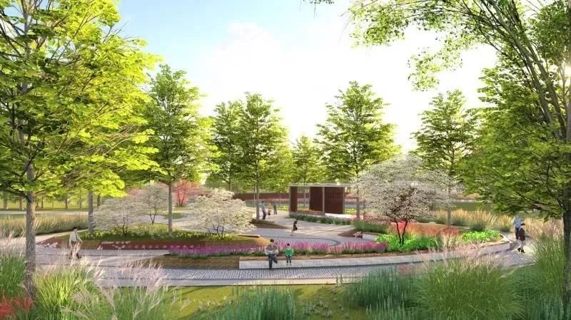 雁栖河两侧将建有6米宽综合绿道和园路系统。综合绿道与市政路顺畅连接、贯穿南北,兼顾巡河与市民骑行、慢跑等需求。主园路与绿道串联,引导游客步入不同主题的绿色空间,次园路引入节点场地为游客提供运动、休憩、交流、科普展示等空间。