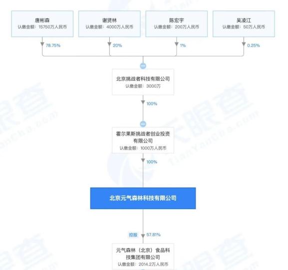 天眼查资料显示," 元気森林 " 所属的元气森林(北京)食品科技集团有限公司,其实是一家土生土长中国饮料公司,其控股股东为股比 57.81% 的北京元气森林科技有限公司,该公司由霍尔果斯挑战者创业投资有限公司 100% 控股;而霍尔果斯挑战者创业投资有限公司则由北京挑战者科技有限公司 100% 控股,北京挑战者科技有限公司最大股东则为持股比例 78.75% 的唐彬森。