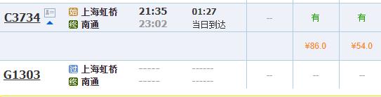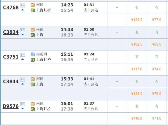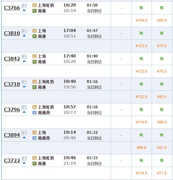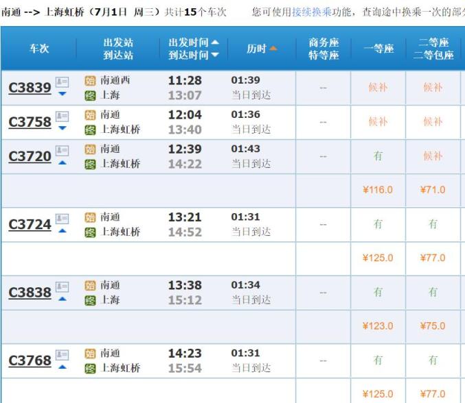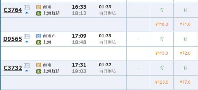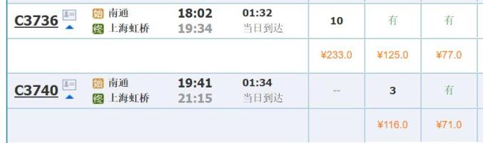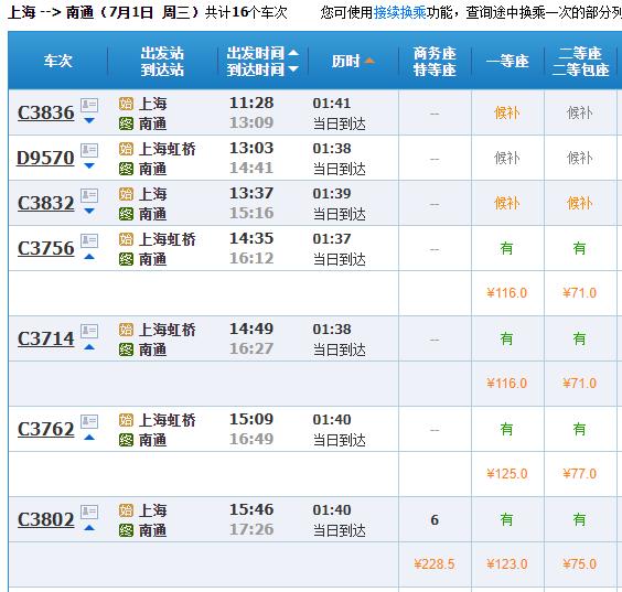7月1日,南通→上海列车票价