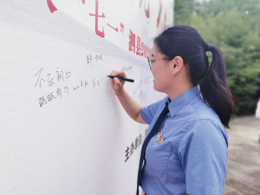涂淬玲为离团入党的青年代表摘下团徽,戴上党徽,赠送《中国共产党章程》,并和在场党员一起进行了入党宣誓,并寄语新党员:“离团入党,不是青春的结束,而是在新的起点上的再次出发。希望青年们能够把对团组织的眷恋深情和青春激情,转化为继续立足本职岗位、发挥表率作用的决心,追梦不负青春、奋斗不负时代,为建设现代化五大发展美好泗县作出新的更大贡献。”