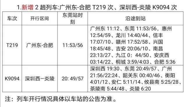 ①新增2趟列车:广州东—合肥T219次、深圳西-炎陵K9094次(如下表)