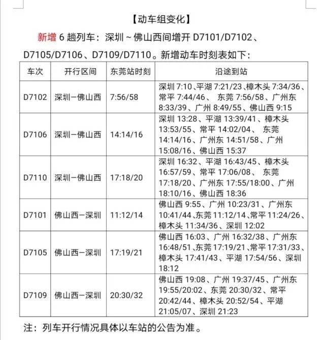 新增6趟列车:深圳—佛山西间增开D7101/D7102、D7105/D7106、D7109/D7110。新增动车时刻表如下: