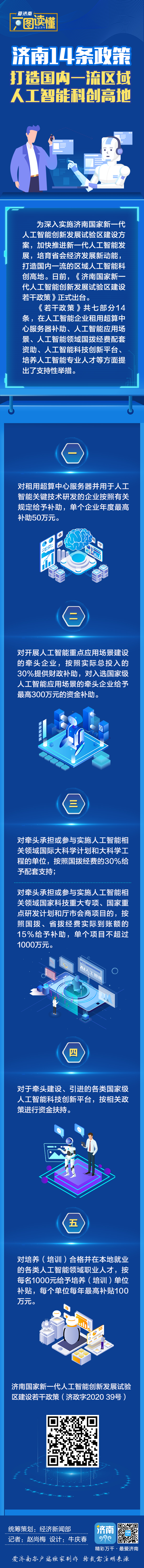 日前,我市出台《济南国家新一代人工智能创新发展试验区若干政策》(以下简称《若干政策》)。今天上午,济南市委市政府新闻发布会召开,据悉,《若干政策》提出,对租用超算中心服务器并用于人工智能关键技术研发的企业按照有关规定给予补助,单个企业年度最高补助50万元;对开展人工智能重点应用场景建设的牵头企业,按照实际总投入的30%提供财政补助,对入选国家级人工智能应用场景的牵头企业给予最高300万元的资金补助。