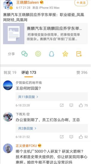 6月17日,王晓麟在微博上转发一篇报道,标题为《赛麟汽车王晓麟回应乔宇东举报:职业碰瓷》。证券时报·e公司记者注意到,该条微博下,上百位网友跟帖评论,其中包括:“王总何时回国?”“办公室到期了,员工们怎么办啊,王总。”更有网友质疑王晓麟吹牛。