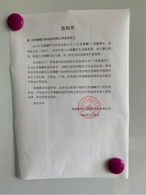 “由于江苏赛麟的董事长、首席执行官、法定代表人王晓麟先生远避美国,怠于履行职责,致使江苏赛麟无以为继,员工的合法权益蒙受严重损失。在此情形下,南通嘉禾作为江苏赛麟的国有股东,为最大程度保障员工的合法权益,将动用自有资金解决江苏赛麟于2020年6月30日前办理完离职手续的全部员工的社保、公积金、个税,并责成江苏赛麟管理委员会的成员负责执行和落实。”