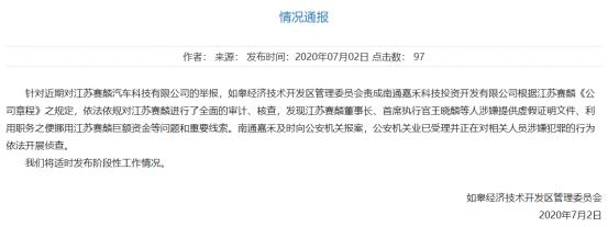 7月2日,如皋经济技术开发区管委会7月2日发布情况通报称:发现赛麟汽车董事长、首席执行官王晓麟等人涉嫌提供虚假证明文件、利用职务之便挪用江苏赛麟巨额资金等问题和重要线索,公安机关业已受理并正在对相关人员涉嫌犯罪的行为依法开展侦查。
