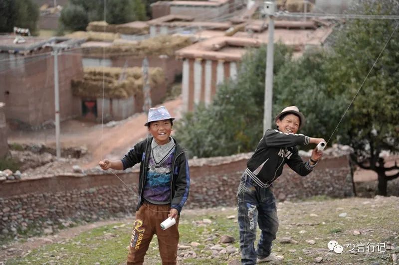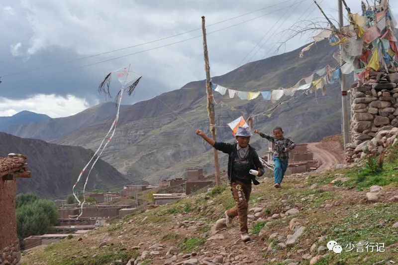 昨晚认识的小男孩森朗丹丹和几个孩子在山坡上放风筝,上上下下地疯跑。他找来其它小伙伴,一起给我展示他们的风筝,这些透明塑料纸的风筝都是森朗丹丹做的。这时,他像个将军指挥着几个风筝同时升空。一个穿黄衣的小喇嘛加入了他们,他也曾是村上的孩子,出了家,依然在村里玩儿。风筝升起的时候,依然是睁着大大的眼球,笑得灿烂。小男孩们在错落的房子间奔跑,很像《追风筝的人》里的镜头。