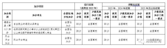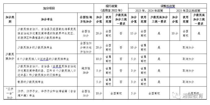 2.自2023年高考起,少数民族自治州、自治县(含享受民族自治地方优惠政策待遇的张家界市永定区、武陵源区和桑植县)和江永县、绥宁县、会同县、沅陵县、慈利县、石门县6个少数民族人口过半县以及少数民族乡的汉族考生,由加5分调减为加3分,2025年高考起取消加分。