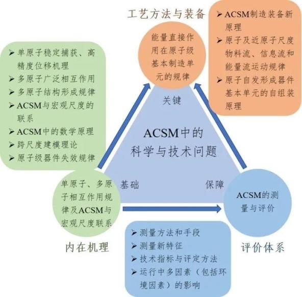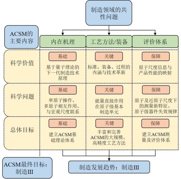 完整的ACSM研究应该从原子及近原子尺度系统性地解决三类制造领域中较为共性的科学问题(分别与内在机理、工艺方法与装备以及评价体系相关),如下图所示。