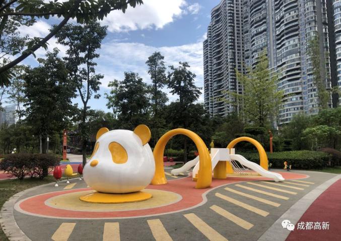 在江滩公园科华南路入口,设有由钢琴步道、熊猫滑梯组成的儿童游乐区,占地面积约200m⊃2;,融入“大熊猫”文化元素,利用色彩童趣构建儿童专属游乐场。