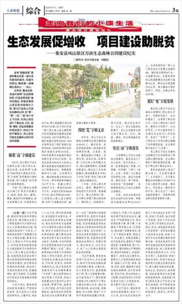 2017年,凤山景区万亩生态森林公园工程启动以来,秦安县委、县政府用“大景区”的标准进行高起点定位,用“大旅游”的思路进行高标准实施,用“大扶贫”的手笔进行高效率推进。