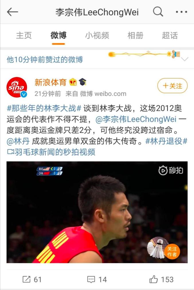 在林丹宣布退役不久后,林丹的“宿敌”、马来西亚羽毛球名将李宗伟就赞了下面这条微博: