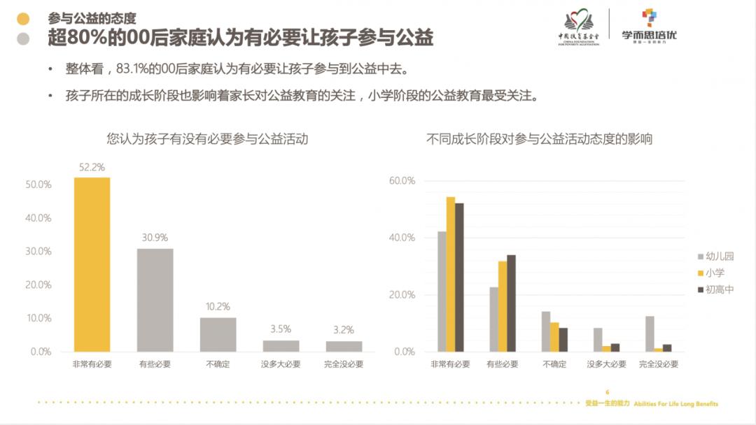 一是大部分00后家长对于公益持积极态度。超80%的00后家庭认为有必要让孩子参与公益,他们让孩子参与公益的目的是全面了解社会,增强孩子的社会责任感、培养孩子的爱心以及沟通、协作等能力。