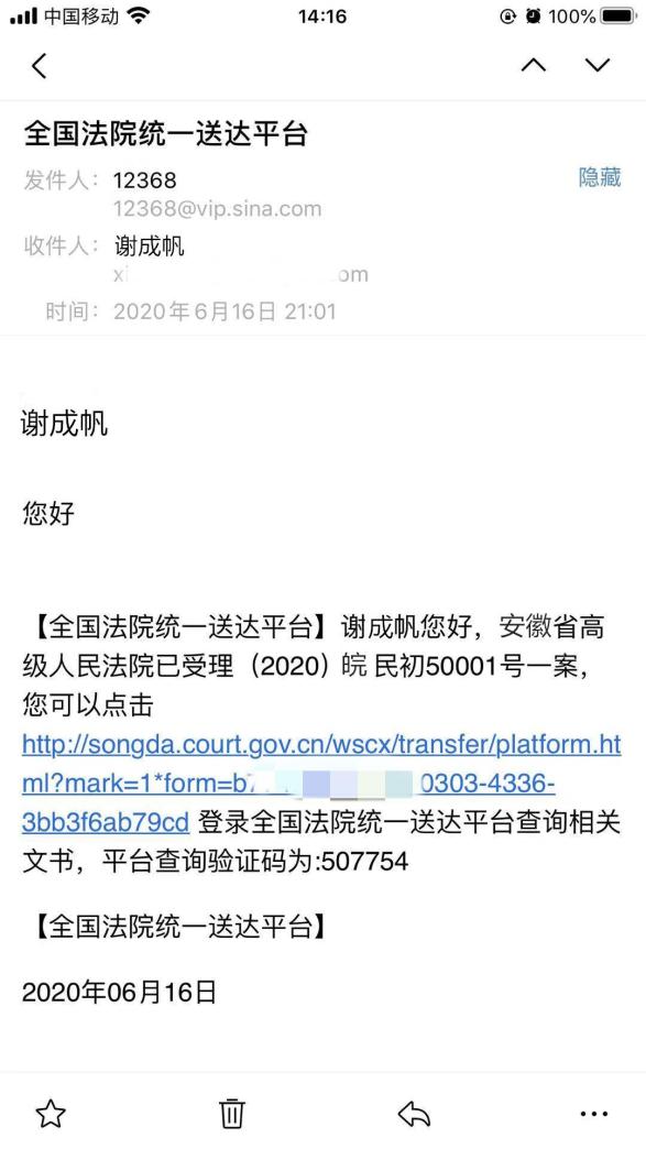 如果当事人提供了电子邮箱的,承办人可以通过该功能给当事人的电子邮箱推送文书,全国法院统一送达平台会通过官方邮箱12368@vip.sina.com发送,当事人收到邮件后只需登录邮箱,点击链接查看即可。