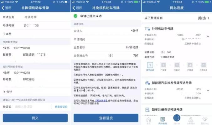 资料填写完成后,点击【下一步】,进入补换领号牌提交页面,确认所填资料信息无误后,获取手机短信验证码,核验通过后,点击【提交】按钮,完成补换领牌证业务申请信息提交。提交成功后,用户可通过【首页】→【网办进度】功能随时查看业务办理进度。
