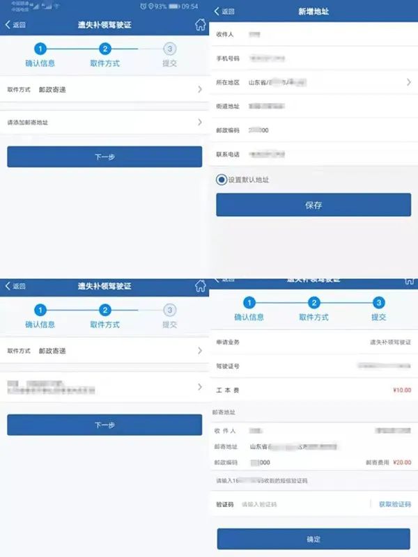 如果选择邮政寄递的方式,用户需认真填写驾驶证邮寄地址等相关信息。用户可以设置默认地址,删除地址,并且使用新地址。点击【使用新地址】,可以新增邮寄地址。并线上支付工本费,邮寄费。